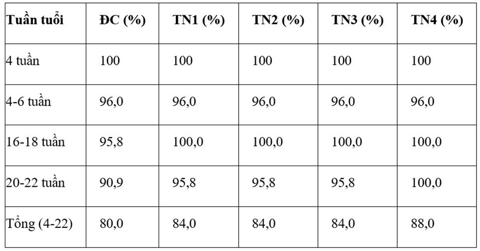 Kết quả cho thấy tỷ lệ sống ở các lô bổ sung dịch trùn quế đều cao hơn so với lô đối chứng. Lô TN4 đạt tỷ lệ sống cao nhất (88%), trong khi lô ĐC chỉ đạt 80%. Sự khác biệt này chủ yếu xảy ra ở giai đoạn sau 16 tuần tuổi.Về sức khỏe, các lô TN có tỷ lệ mắc bệnh đường tiêu hóa và hô hấp thấp hơn đáng kể so với lô ĐC. Điều này có thể do các peptide kháng khuẩn và hợp chất tăng cường miễn dịch trong dịch trùn quế đã giúp nâng cao sức đề kháng của đàn gà.