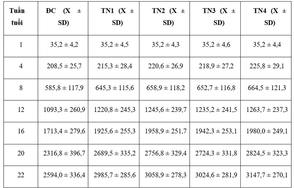 Khối lượng cơ thể tăng dần theo tuần tuổi ở tất cả các lô. Từ tuần thứ 6 trở đi, các lô TN luôn có khối lượng cao hơn hẳn so với lô ĐC. Đến 22 tuần tuổi, khối lượng trung bình của lô TN4 đạt 3147,7 g, cao hơn có ý nghĩa thống kê (p<0,05) so với lô ĐC (2594,0 g).Tốc độ sinh trưởng tuyệt đối (ADG) trung bình cả giai đoạn 4-22 tuần của các lô TN dao động từ 19,85-21,61 g/ngày, cao hơn so với lô ĐC (17,66 g/ngày). Tốc độ sinh trưởng tương đối (RGR) cao nhất ở giai đoạn đầu và giảm dần theo thời gian.