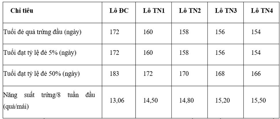 Cụ thể, gà mái ở lô TN4 thành thục sinh dục sớm nhất, với tuổi đẻ quả trứng đầu tiên và đạt tỷ lệ đẻ 5% là 154 ngày tuổi, sớm hơn 18 ngày so với lô ĐC (172 ngày). Tuổi đạt tỷ lệ đẻ 50% của lô TN4 là 166 ngày, sớm hơn 17 ngày so với lô ĐC (183 ngày). Điều này cho thấy việc bổ sung dịch trùn quế với liều lượng cao và ổn định (TN4) đã rút ngắn đáng kể thời gian thành thục của đàn gà.