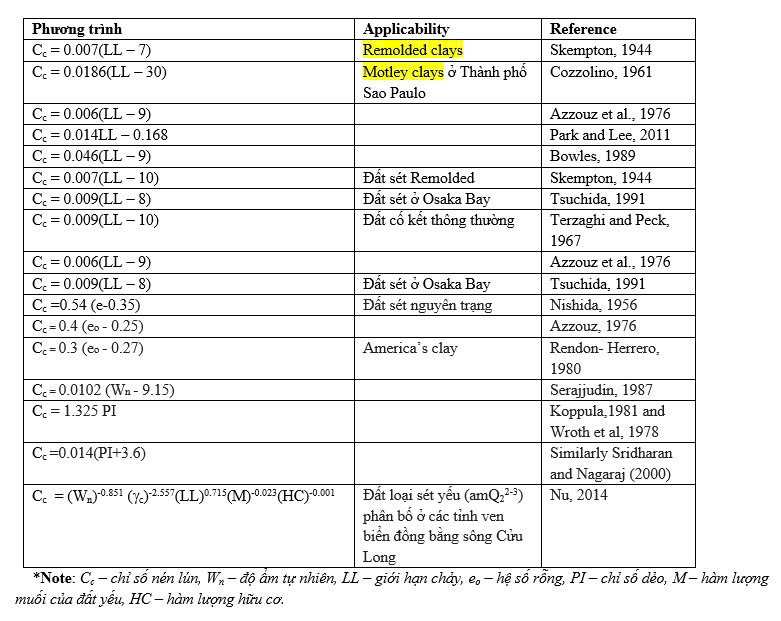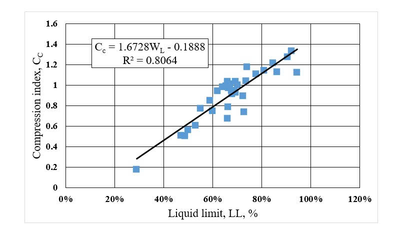 Jain et al [8] chỉ ra rằng có tương quan cao giữa chỉ số nén lún và chỉ số dẻo của đất yếu ở nhiều thung lũng sông ở Ấn Độ. Điều này được cho là khi giới hạn chảy tăng lên sẽ dẫn đến chỉ số nén lún tăng. Phân tích mối quan hệ hồi quy tuyến tính giữa chỉ số nén lún và chỉ số dẻo, và được thể hiện như sau Cc =0.0082 PU +0.0475 và hệ số xác định R2 là 0.898.