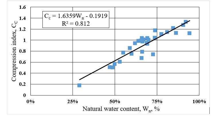 Đầu tiên, mối quan hệ giữa chỉ số nén lún và độ ẩm tự nhiên được xác định như ở hình 5. Có thể thấy rằng độ ẩm tự nhiên tăng lên dẫn đến chỉ số nén lún tăng. Điều này phù hợp với kết quả của Nu et al [17] và Nu [18]. Điều này được cho là do độ ẩm tự nhiên của nước tăng lên làm cho độ nén của đất cao, và vì vậy chỉ số nén lún tăng.