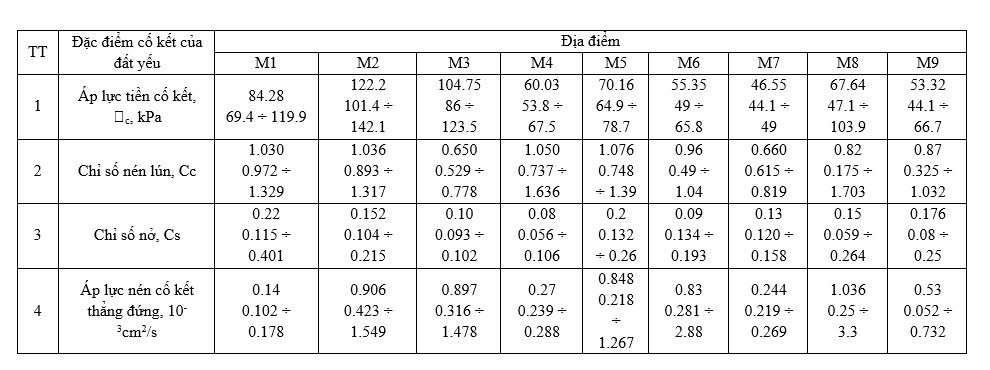 Bảng 2. Kết quả nghiên cứu đặc điểm cố kết của đất yếu