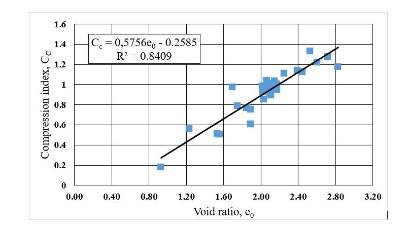 Cuối cùng, mối quan hệ giữa chỉ số nén lún và hệ số rỗng được thể hiện ở hình 7. Có thể thấy ở hình 7, hệ số rỗng tăng lên dẫn đến chỉ số nén lún tăng. Điều này là phù hợp với kết quả của Nu et al [17] và Nu [18]. Điều này được cho là khi giới hạn chảy tăng lên sẽ làm cho độ nén của đất cao và vì thế chỉ số nén lún tăng.