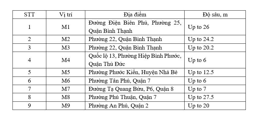 Để tiến hành nghiên cứu đặc điểm cố kết của đất, các mẫu đất được lấy từ các lỗ khoan ở nhiều địa điểm khác nhau của Thành phố Hồ Chí Minh. Độ sâu của mẫu và vị trí lấy mẫu được thể hiện ở Bảng 1.