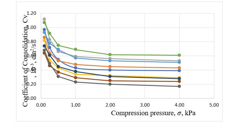 - Hệ số cố kết có xu hướng giảm dần khi tăng áp lực nén.