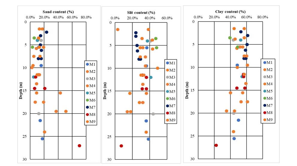 Thí nghiệm thành phần hạt, tính chất vật lý của đất, đặc điểm cố kết của đất được xác định trên các mẫu nguyên trạng lấy về. Thành phần hạt được xác định theo tiêu chuẩn ASTM D422. Các giới hạn chảy được xác định theo các tiêu chuẩn ASTM D4318 – e1. Kết quả thành phần hạt và các chỉ tiêu cơ lý của đất yếu được trình bày ở hình 1 và hình 2.