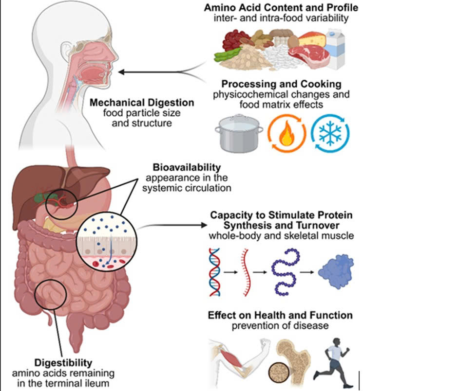 Chất lượng protein chịu ảnh hưởng bởi thành phần amino acid thiết yếu và khả năng tiêu hóa, đồng thời thay đổi theo cách chế biến, nấu ăn và quá trình nhai - tiêu hóa. Sau khi được hấp thu, các amino acid sẽ được cơ thể sử dụng cho tổng hợp và chuyển hóa protein, với mức độ khác nhau tùy vào khẩu phần ăn và tình trạng sinh lý.
