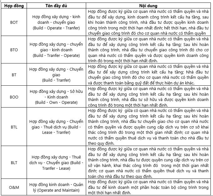 Bảng 1: Các hình thức hợp đồng PPP cho đến 2020