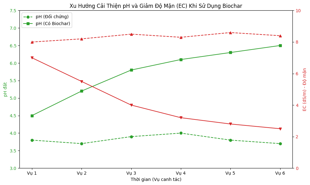 Biểu đồ 1: Xu hướng cải thiện pH đất và giảm độ mặn (EC) qua các vụ canh tác khi sử dụng Biochar. Dữ liệu minh họa từ mô hình thí điểm tại tỉnh Sóc Trăng.