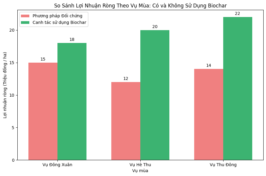 Biểu đồ 2: So sánh lợi nhuận ròng (triệu đồng/ha) từ canh tác lúa giữa phương pháp đối chứng và phương pháp sử dụng Biochar tại Cà Mau.