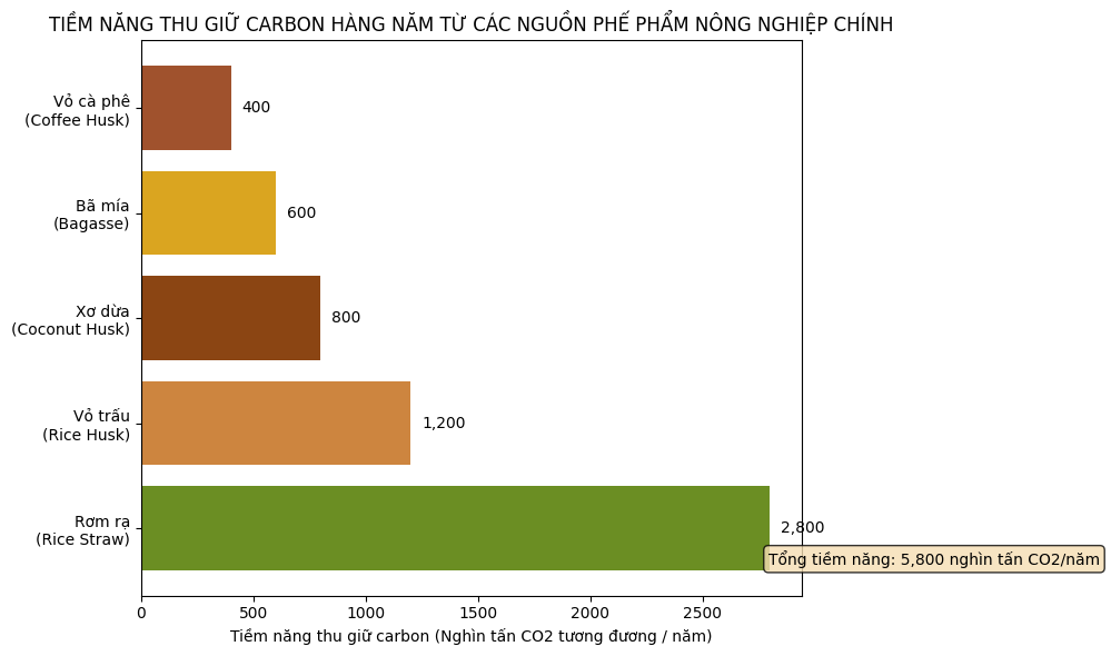 Biểu đồ 3: Tiềm năng thu giữ carbon hàng năm từ việc chuyển đổi các nguồn phế phẩm nông nghiệp chính ở ĐBSCL thành Biochar.