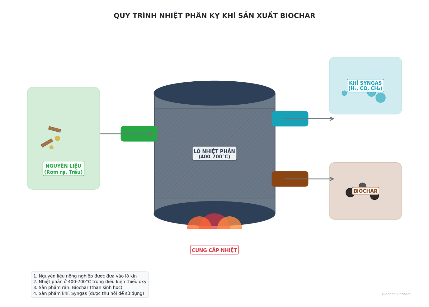 Hình 1: Quy trình nhiệt phân kỵ khí biến rơm rạ, trấu thành than sinh học Biochar. Prompt tạo ảnh: Minh họa đồ họa vector một lò nhiệt phân kín đang chuyển đổi nguyên liệu hữu cơ thành biochar, khí syngas được thu hồi, với các mũi tên chỉ dòng nguyên liệu đầu vào và sản phẩm đầu ra.
